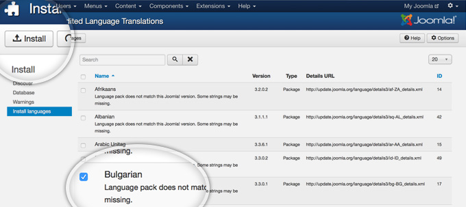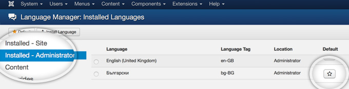 In few seconds, the new language pack will be installed into your application. Now, you simply have to make it deault for the part of the website you want to. In our case, we want to change the admin area language. Select the Installed – Administrator tab from the left column and click on the button with a star icon next to the language you want to set to default (in our case – Bulgarian).