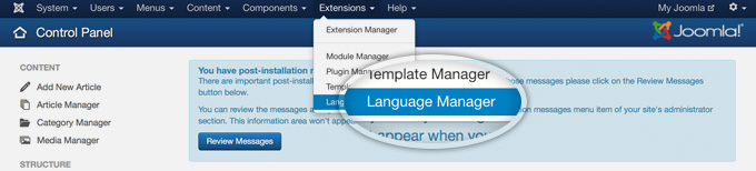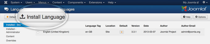 To begin, first login to your Joomla admin area. Next, go to Extensions -> Language Manager to open the list of installed languages for your site.