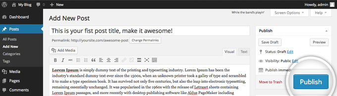 Once you enter the content of your first WordPress post, you need to Publish it. Publishing brings your post to your actual website.