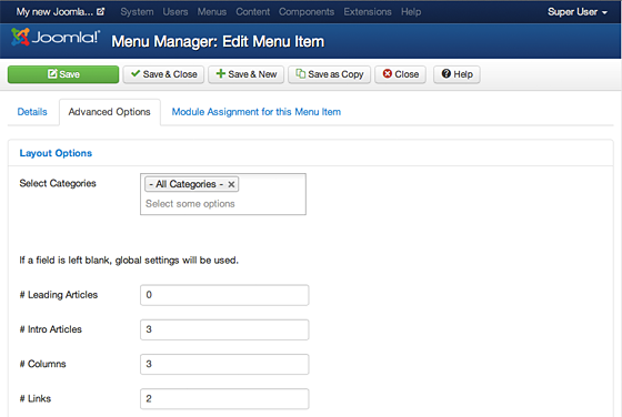 You can change the way articles are displayed through the menu item’s Advanced Options tab (Menus -> Main Menu -> Menu Item -> Advanced Options Tab). The first article, that takes all of the width is called Leading Article. You can assign any number of articles you want, including 0, to be displayed this way. For this example we will choose 0, as we do not want any article to be displayed in full width. Next you can choose how many intro articles will be shown after the leading ones on this page (we choose 6). You can also choose in how many Columns to show the Intro articles (we chose 3). Finally, choose how many of the remaining featured articles to be listed as Links at the bottom (we chose 3).