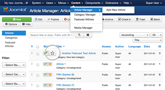 First, you need to mark some articles in your site as Featured. To do this go to Content -> Articles Manager. Here, you will see a list of your articles. Note that there is a star next to each article. To mark an article as Featured, simply press the star next to it. It will turn yellow, indicating that you’ve marked this article as featured.